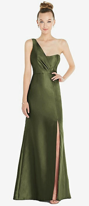 Draped One-Shoulder Satin Trumpet Gown with Front Slit in olive green