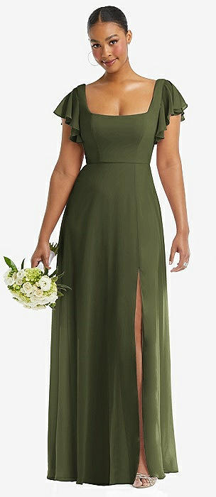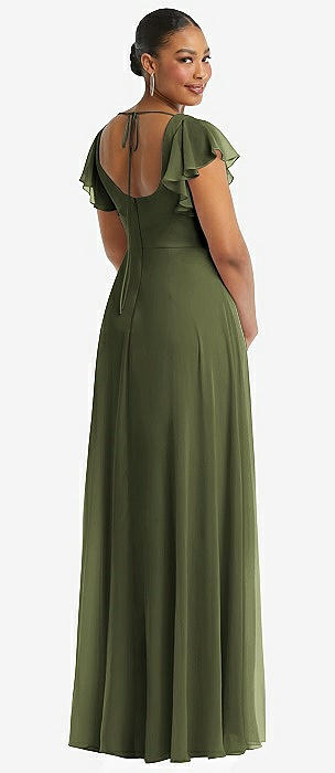 Flutter Sleeve Scoop Open-Back Chiffon Maxi Dress in olive green