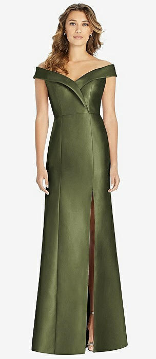 Off-the-Shoulder Cuff Trumpet Gown with Front Slit in olive green