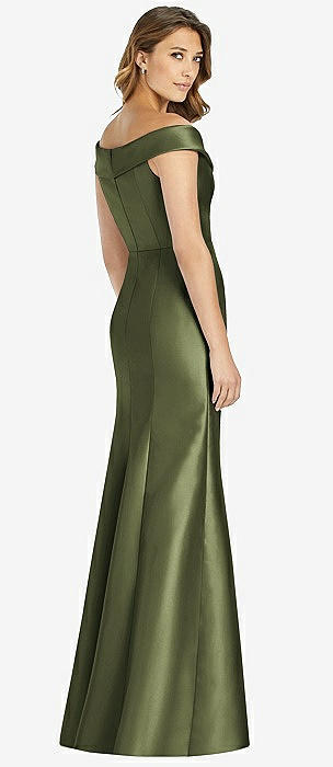 Off-the-Shoulder Bow-Back Satin Trumpet Gown in olive green