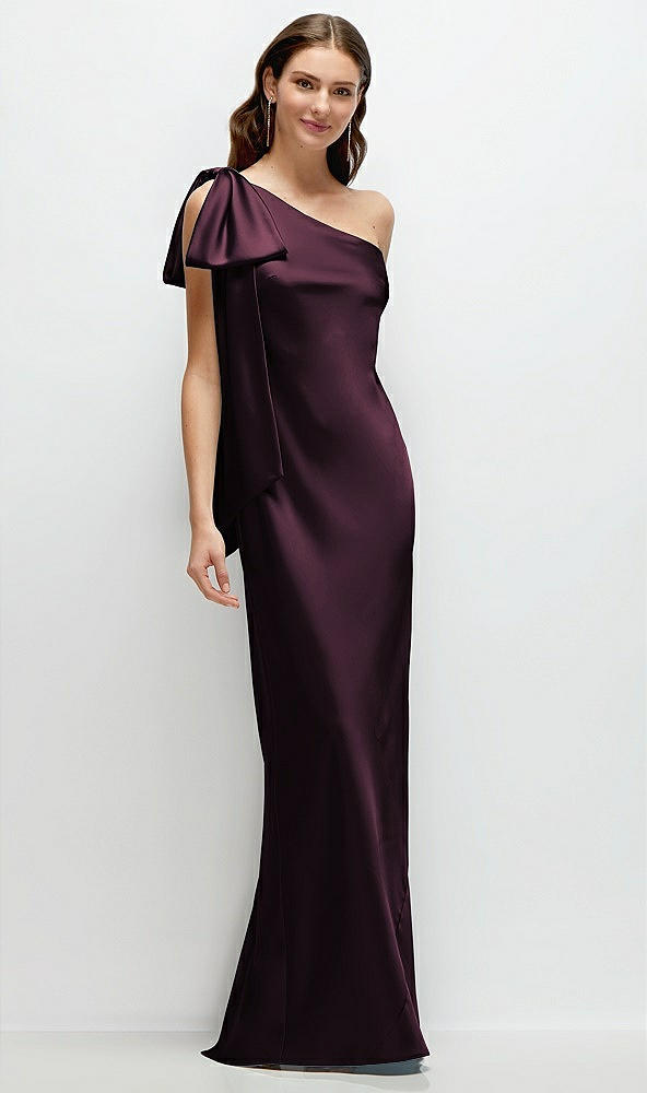 One-Shoulder Bias-Cut Satin Maxi Dress with Cascading Shoulder Bow in Deep Plum
