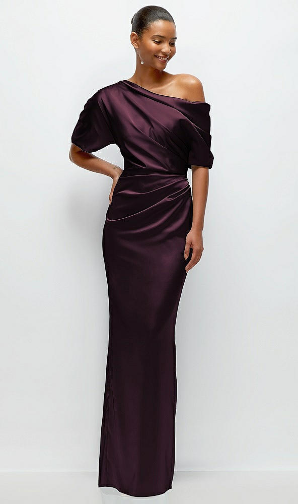 Asymmetrical Off-the-Shoulder Pleated Satin Maxi Dress in Deep Plum