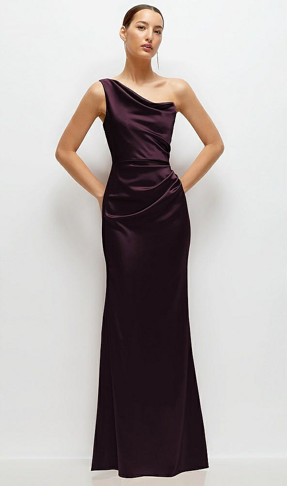 One-Shoulder Cat-Eye Neckline Fit and Flare Satin Maxi Dress in Deep Plum