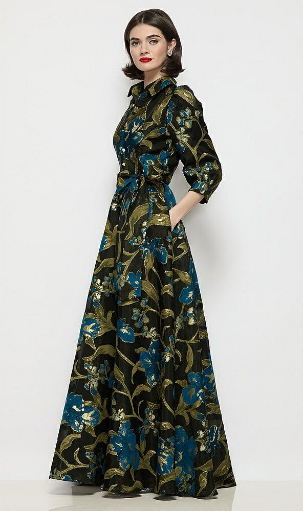 Luna Organza Jacquard Floral Shirt Dress with Full Maxi Skirt & Sash in Peacock Blue Multi