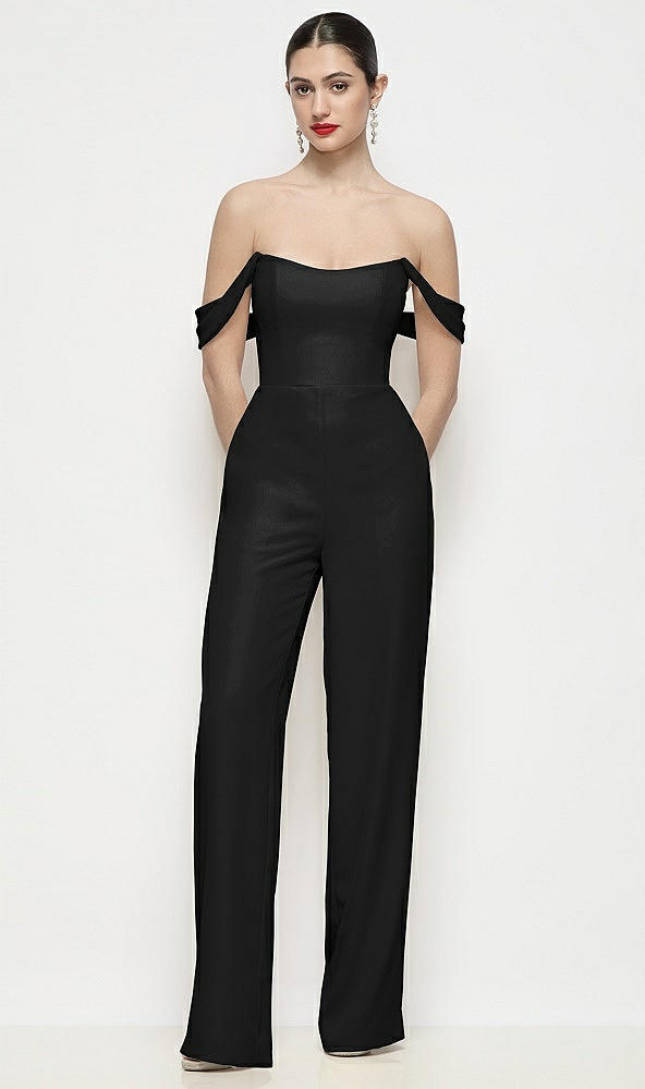 Off-the-Shoulder Basque Neck Crepe Wide Leg Formal Jumpsuit in Black