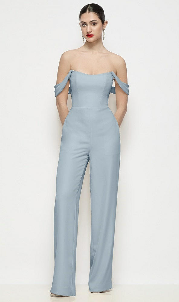 Off-the-Shoulder Basque Neck Crepe Wide Leg Formal Jumpsuit in Mist
