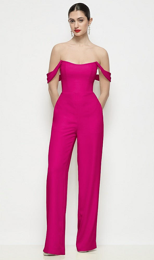 Off-the-Shoulder Basque Neck Crepe Wide Leg Formal Jumpsuit in Think Pink