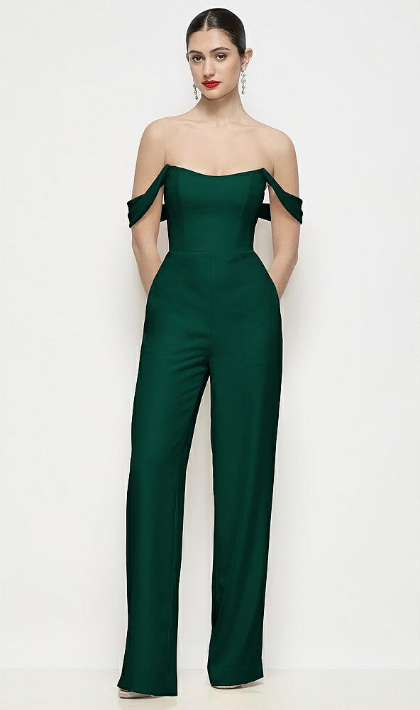 Off-the-Shoulder Basque Neck Crepe Wide Leg Formal Jumpsuit in Hunter Green