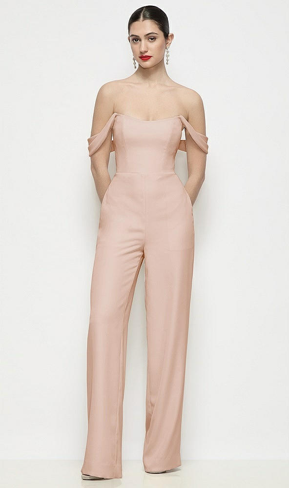 Off-the-Shoulder Basque Neck Crepe Wide Leg Formal Jumpsuit in Cameo