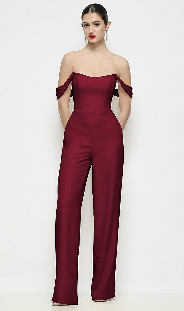 Off-the-Shoulder Basque Neck Crepe Wide Leg Formal Jumpsuit in Burgundy