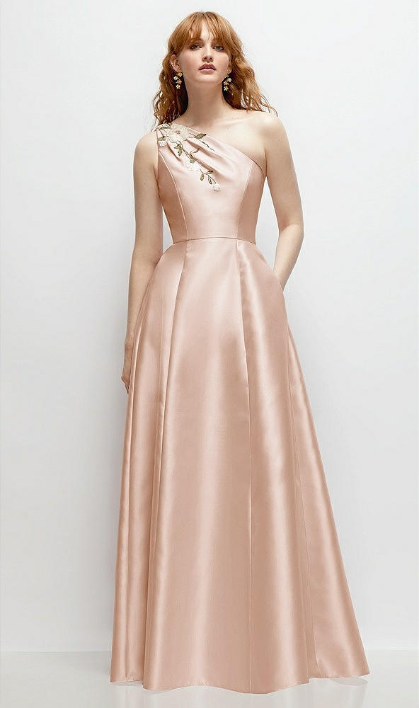 One-Shoulder Full A-Line Satin Gown with Handworked Floral Appliqué in Cameo