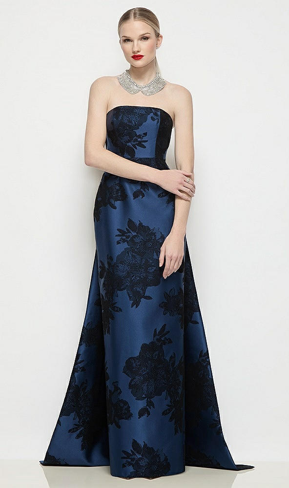 Strapless Flocked Floral Satin Column Dress with Removable Watteau Train in Soft Navy / Black