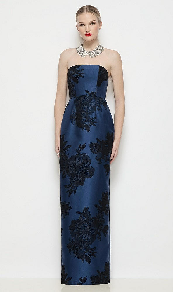 Strapless Flocked Floral Satin Column Dress with Back Slit in Soft Navy / Black