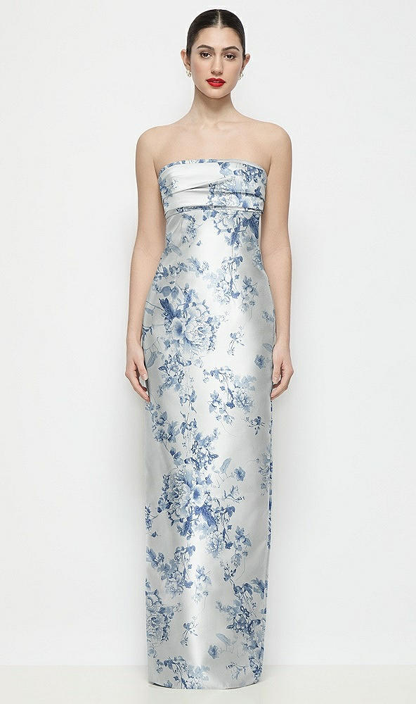 Strapless Pleated Empire Floral Satin Column Maxi Dress in Cottage Rose Larkspur