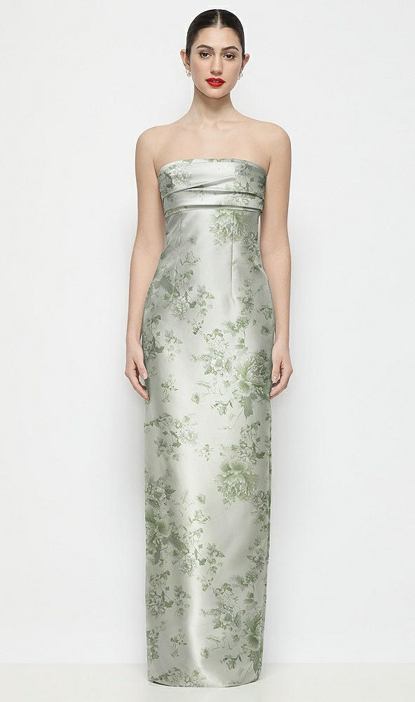 Strapless Pleated Empire Floral Satin Column Maxi Dress in Sage Cottage Rose
