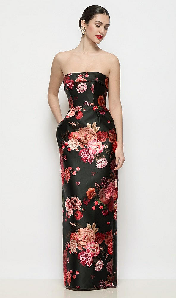 Strapless Cuff Neck Fleur de Villes Satin Maxi Dress with Column Skirt in Wine Black Multi