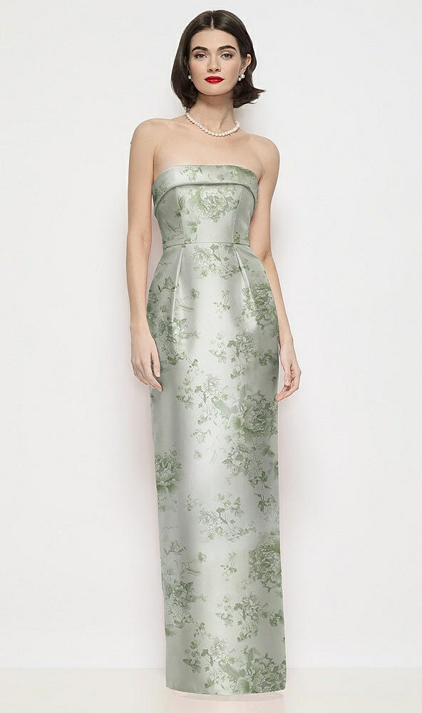 Strapless Cuff Neck Floral Satin Maxi Dress with Column Skirt in Sage Cottage Rose