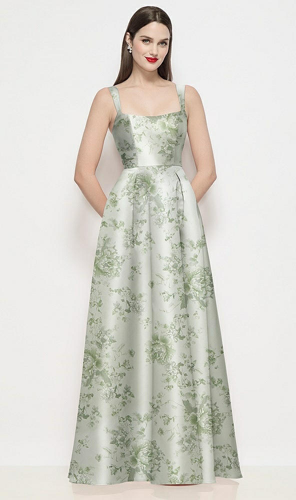 Shaped Strap Basque Neck Floral Satin Maxi Dress with Pleated Skirt in Sage Cottage Rose