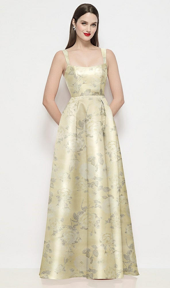 Shaped Strap Basque Neck Floral Satin Maxi Dress with Pleated Skirt in Butter Yellow Floral