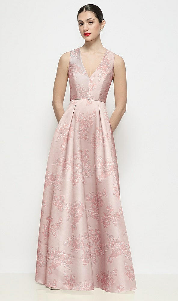 Sleeveless V-neck Floral Satin Maxi Dress with Pleated Skirt in Bow And Blossom Print