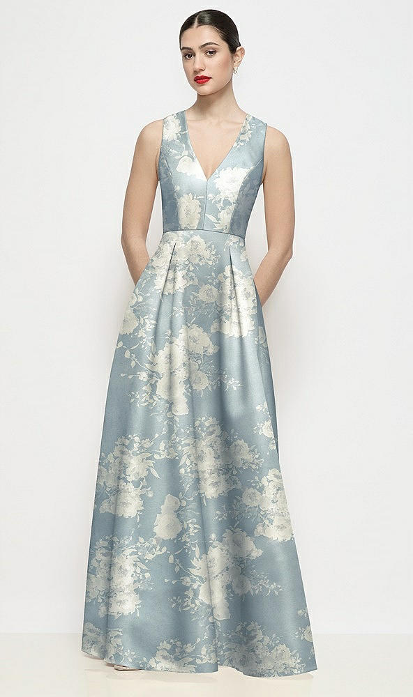 Sleeveless V-neck Floral Satin Maxi Dress with Pleated Skirt in Porcelain Blue Seraphina Floral