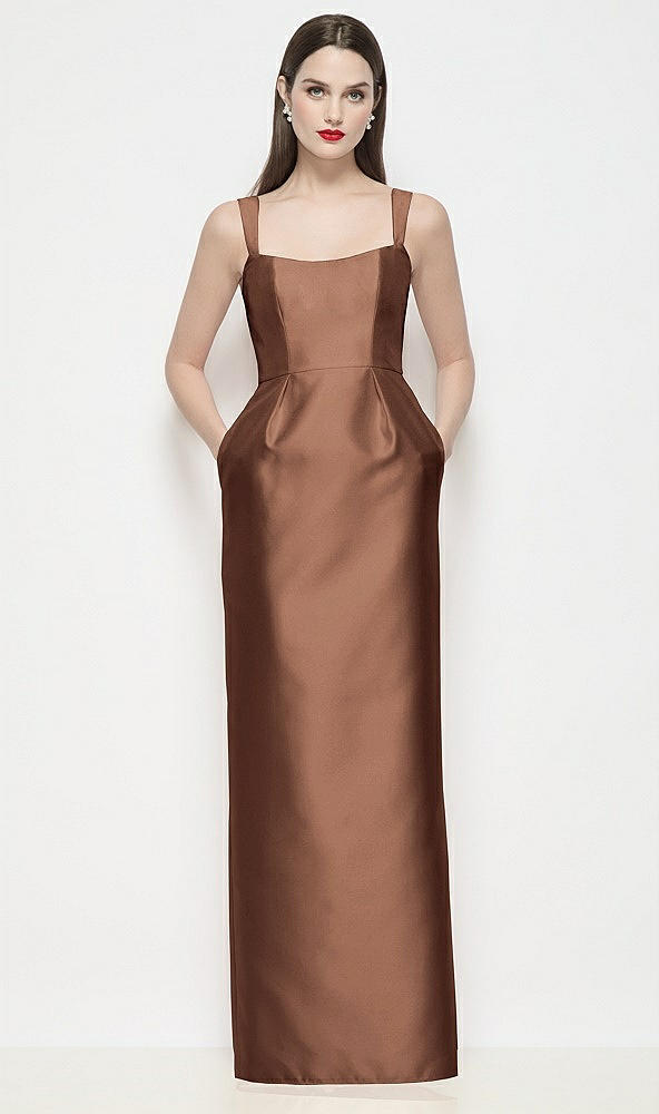 Shaped Strap Basque Neck Satin Maxi Dress with Column Skirt in Cognac