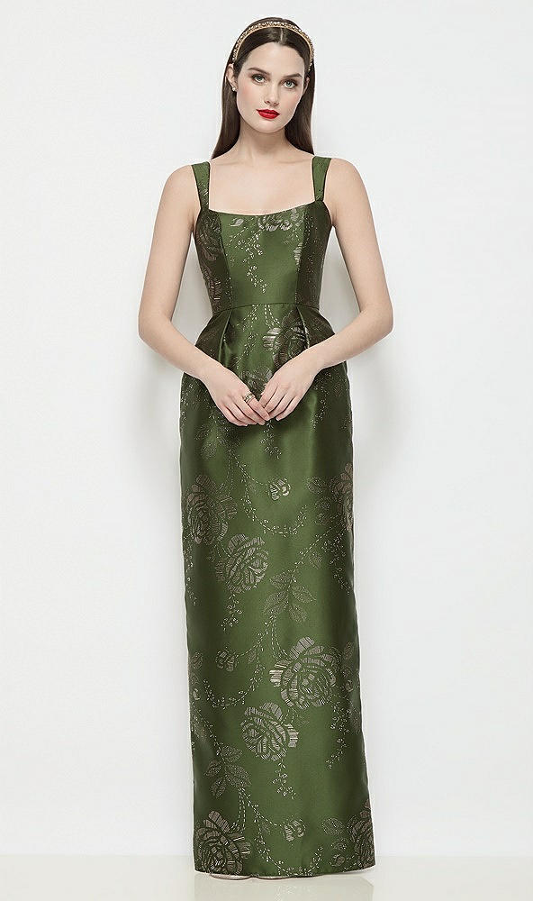 Shaped Strap Basque Neck Embossed Gilt Floral Satin Column Maxi Dress in Olive / Gold
