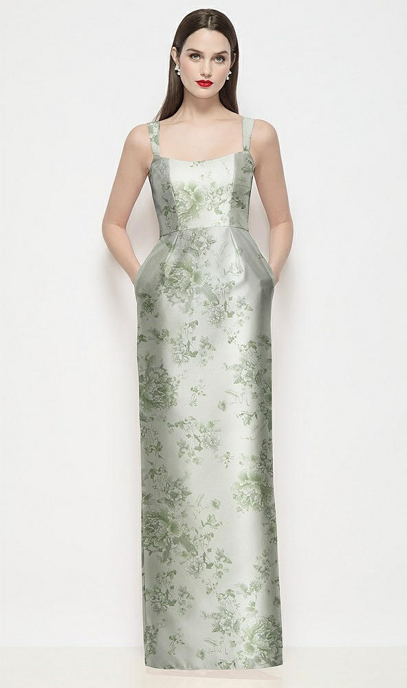 Shaped Strap Basque Neck Floral Satin Maxi Dress with Column Skirt in Sage Cottage Rose