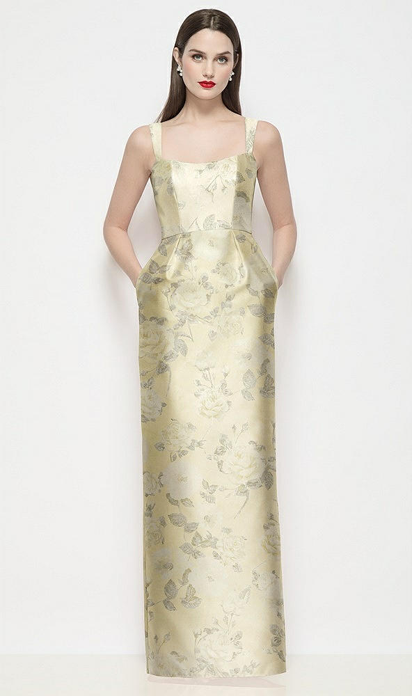 Shaped Strap Basque Neck Floral Satin Maxi Dress with Column Skirt in Butter Yellow Floral