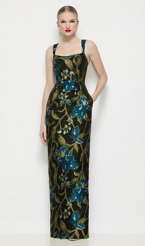 Shaped Strap Basque Neck Luna Organza Jacquard Floral Maxi Dress with Column Skirt in Peacock Blue Multi