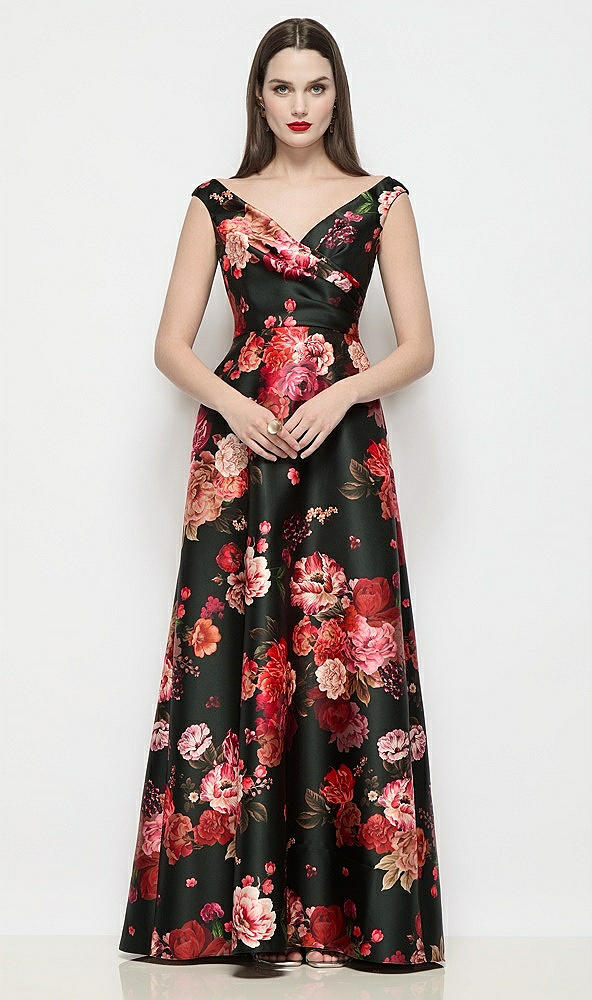 Off-the-Shoulder Pleated Crossover Fleur de Villes Satin A-Line Maxi Dress in Wine Black Multi
