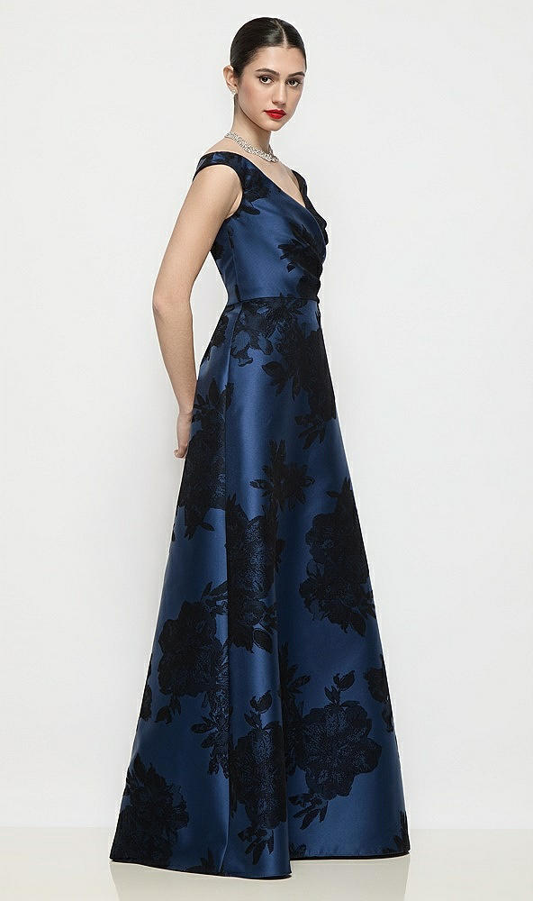 Off-the-Shoulder Pleated Crossover Flocked Floral Satin A-Line Maxi Dress in Soft Navy / Black
