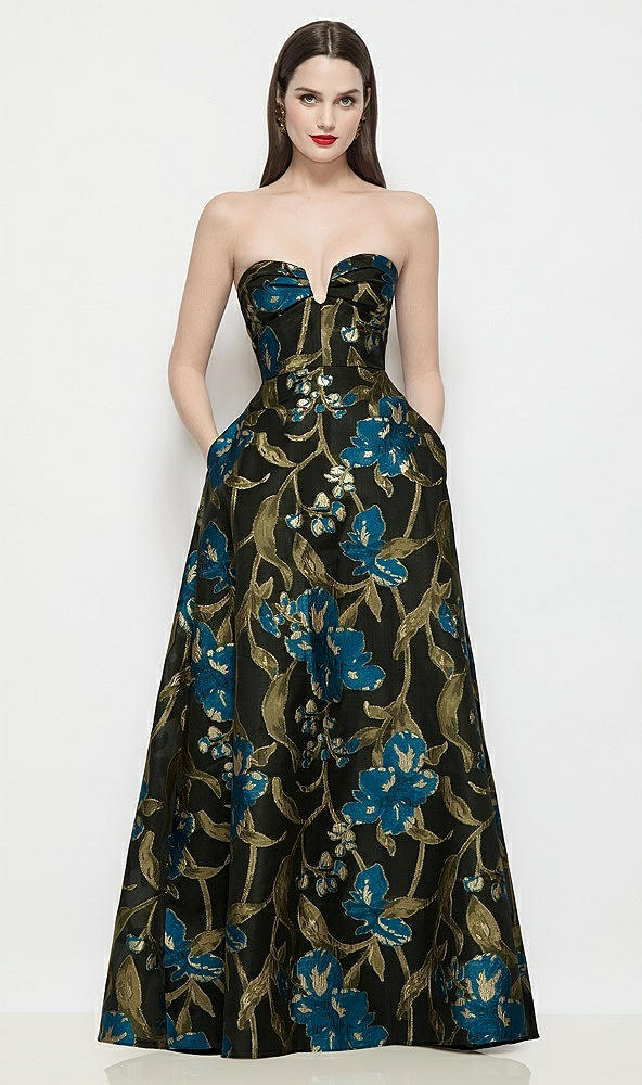 Strapless Pleated U-Wire Organza Jacquard Floral Maxi Dress with Semi Circle Skirt in Peacock Blue Multi