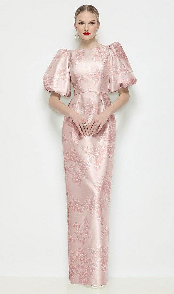 Bateau Neck Floral Satin Column Maxi Dress with Puff Sleeves in Bow And Blossom Print