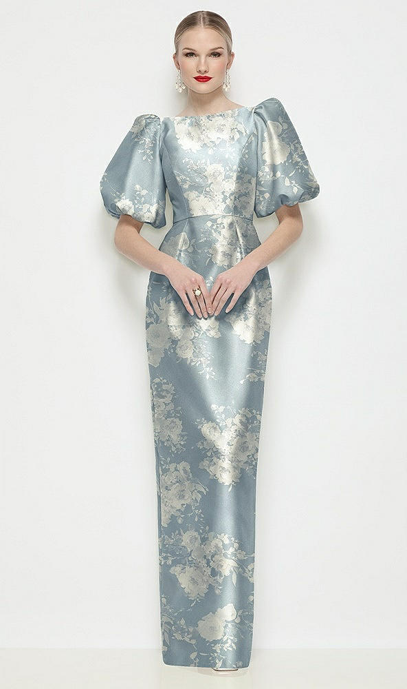 Bateau Neck Floral Satin Column Maxi Dress with Puff Sleeves in Porcelain Blue Seraphina Floral