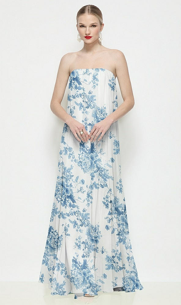 Strapless Shirred Floral Chiffon Trapeze Maxi Dress in Cottage Rose Dusk Blue