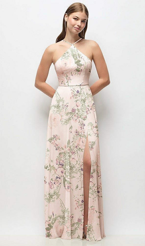 High-Neck Halter Floral Chiffon Maxi Dress with Adjustable Spaghetti Straps in Blush Garden