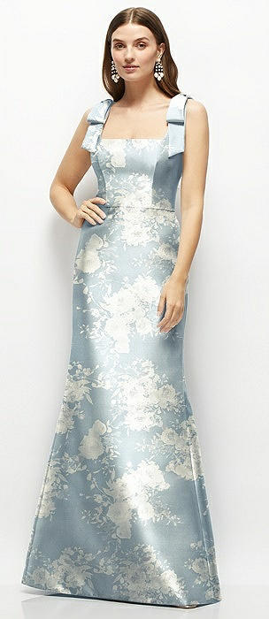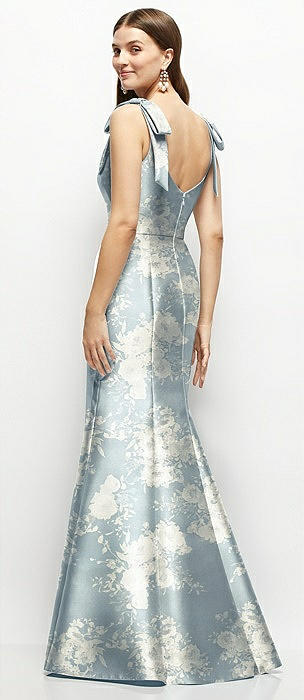 Deep V-back Floral Satin Trumpet Dress with One-Shoulder Cascading Bow in porcelain blue seraphina floral