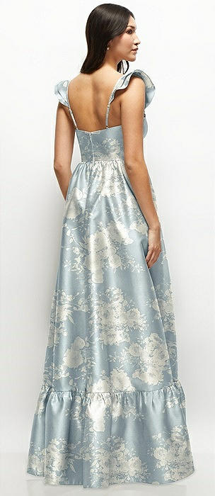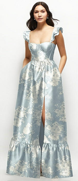Floral Satin Corset Maxi Dress with Ruffle Straps & Skirt in porcelain blue seraphina floral