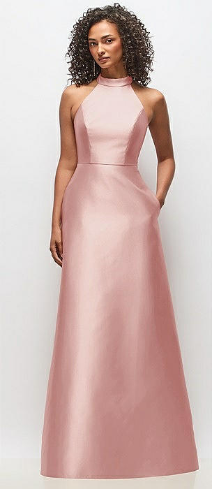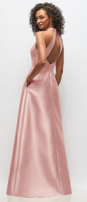 High-Neck Halter Open-Back Satin Trumpet Dress in rose