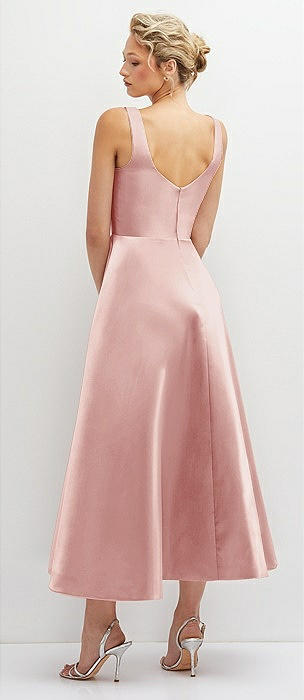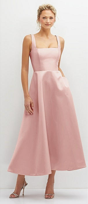 Square Neck Satin Midi Dress with Full Skirt & Pockets in rose