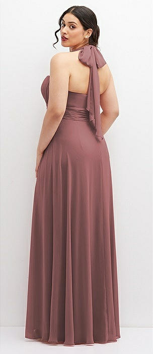 Shirred Skirt Jewel Neck Halter Dress with Front Slit in rosewood
