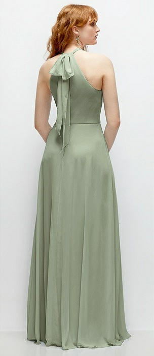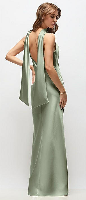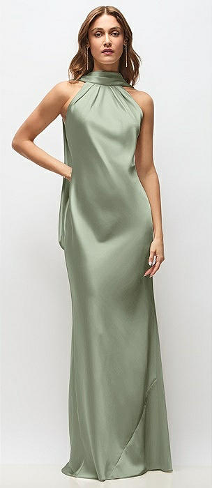 Draped Scarf Halter Open-Back Stretch Satin Bias Maxi Dress with Adjustable Straps in sage