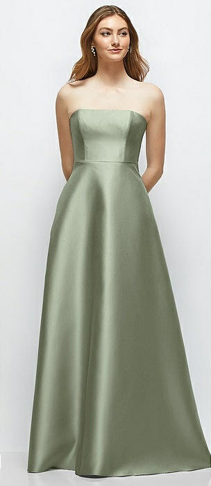 Strapless Bias Cuff Bodice Satin Gown with Pockets in sage