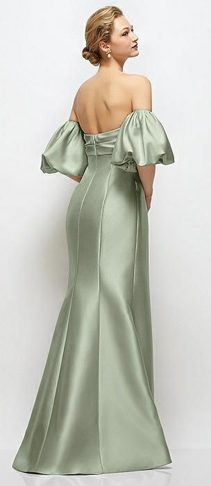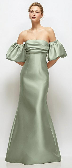 Off-the-Shoulder Puff Sleeve Satin Maxi Dress with Flared Skirt in sage
