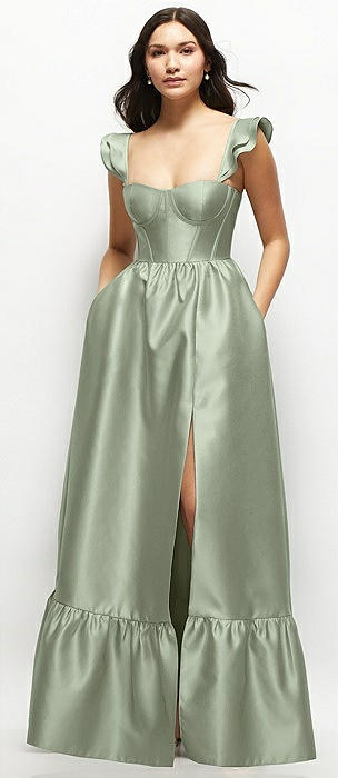 Satin Corset Maxi Dress with Ruffle Straps & Skirt in sage