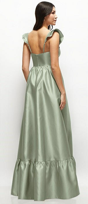 Bow-Shoulder Satin Maxi Dress with Asymmetrical Tiered Skirt in sage