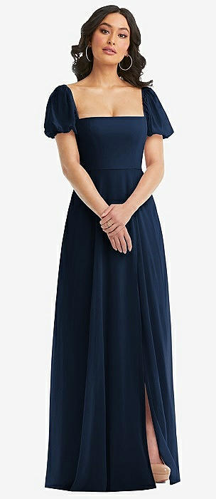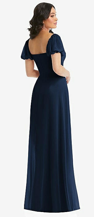 Puff Sleeve Chiffon Maxi Dress with Front Slit in midnight navy