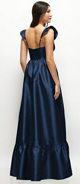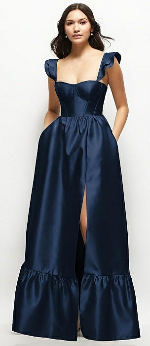 Satin Corset Maxi Dress with Ruffle Straps & Skirt in midnight navy