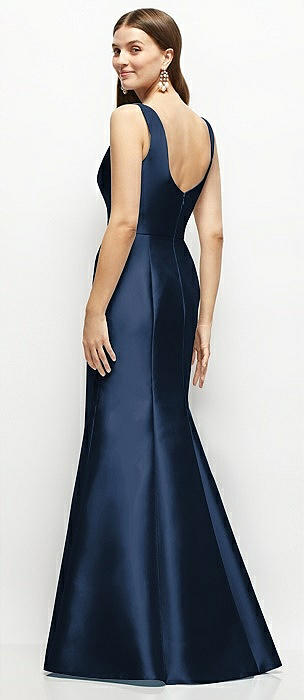 Deep V-back Satin Trumpet Dress with Cascading Bow at One Shoulder in midnight navy